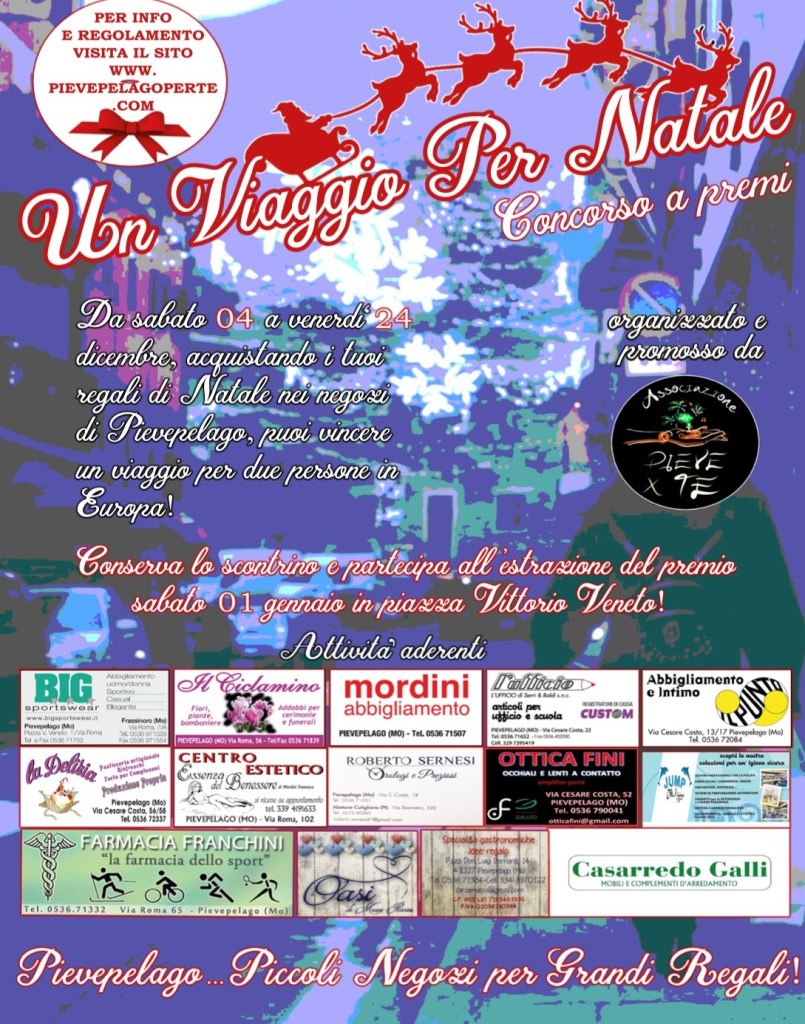 Dal 04/12/2021 al 24/12/2021 con un acquisto minimo di € 20,00 per i tuoi regali di Natale presso i negozi di Pievepelago (sotto riportati) è possibile vincere un viaggio in Europa per due persone! Conserva la scontrino e partecipa all’estrazione del premio il 31/12/2021 in piazza Vittorio Veneto!