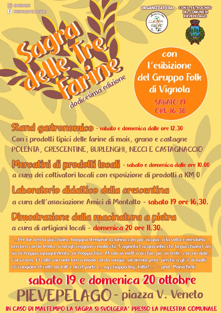 Ritorna sabato 19 e domenica 20 ottobre la dodicesima edizione della Sagra delle Tre Farine, organizzata dall’associazione Pievepelago Per Te APS, in piazza Vittorio Veneto a Pievepelago (MO).