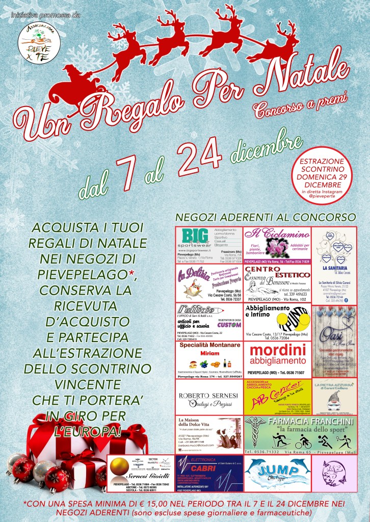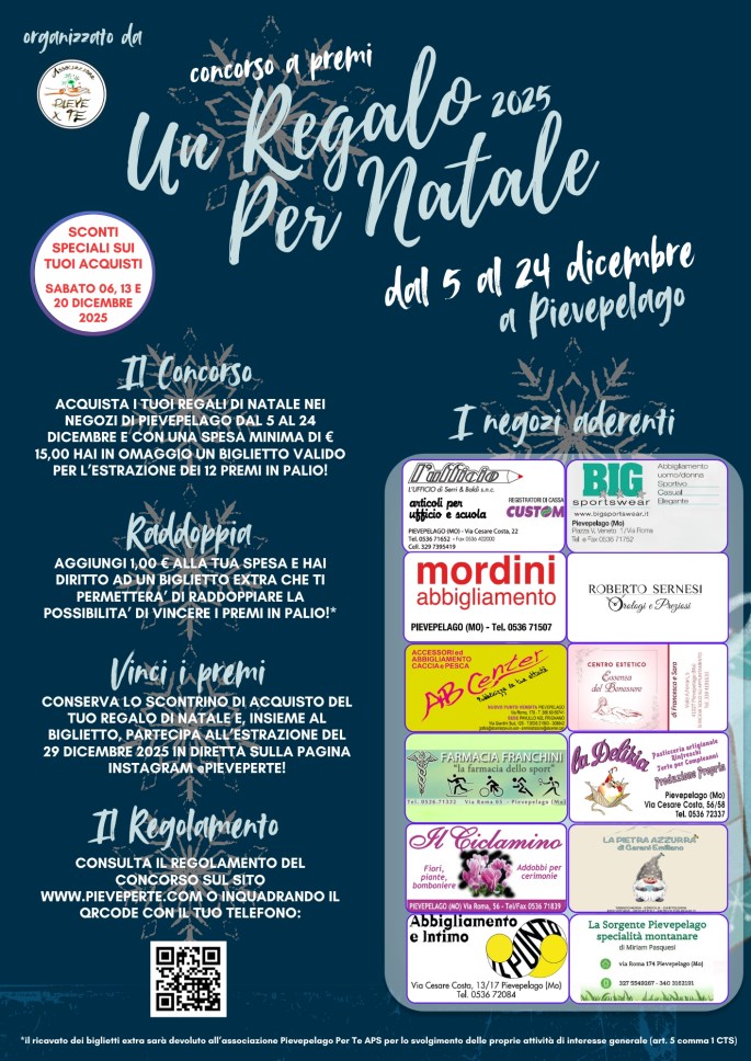 Dal 5 al 24 dicembre 2025 ritorna il concorso a premi “Un Regalo Per Natale” che promuove l’acquisto dei regali di natale nei negozi di Pievepelago a sostegno del commercio locale durante il periodo delle feste natalizie.