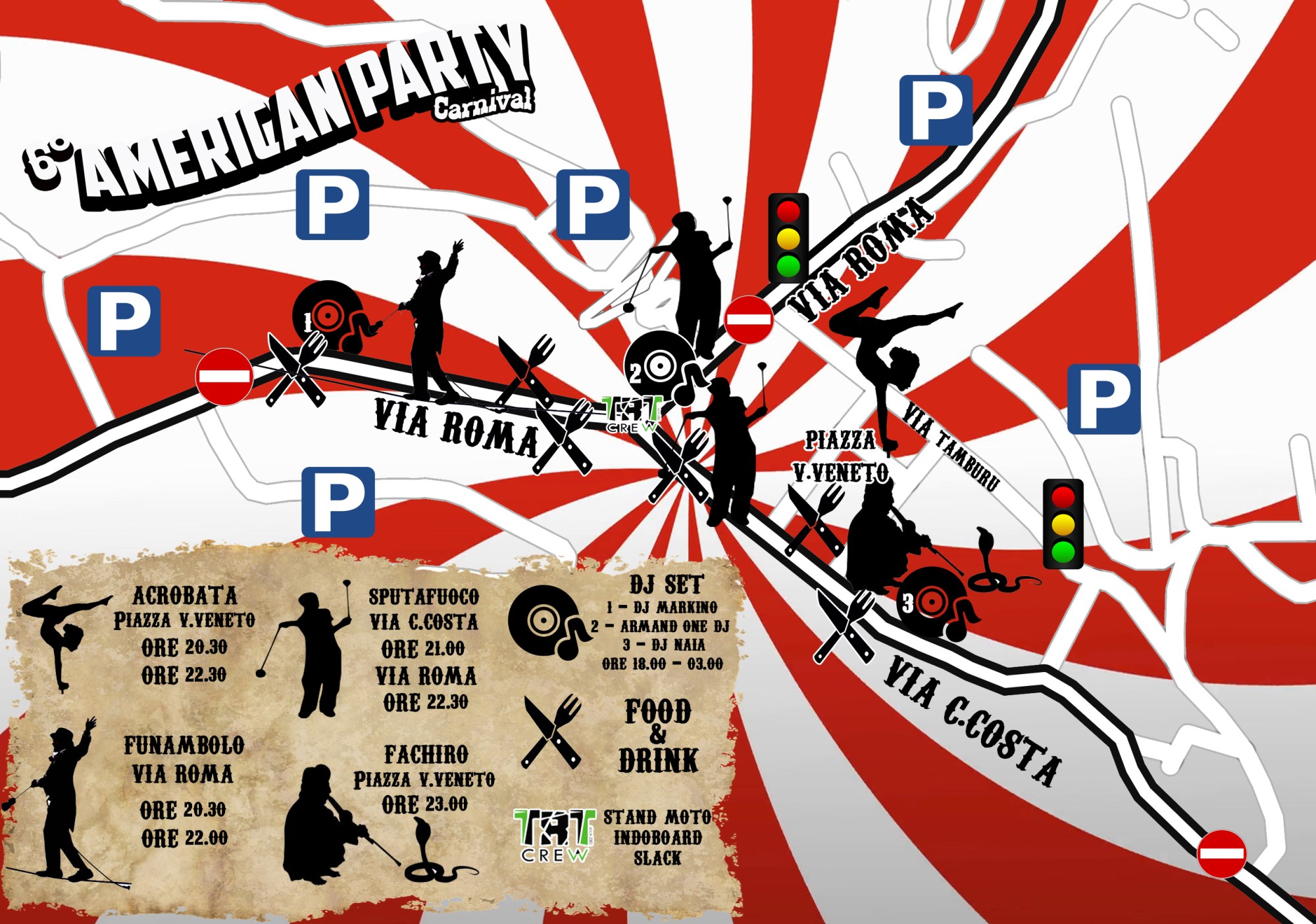 Per non perdervi neanche uno degli spettacoli proposti da veri e propri professionisti delle arti circensi e dai vari dj in ogni angolo del paese, questa è l’American Map, che localizza artisti, dj e stand gastronomici! Questo sabato, dalle ore 20.00 alle ore 03.00, il centro del paese verrà chiuso al traffico con il posizionamento di due semafori all’inizio e alla fine di via Tamburù per permettere un senso alternato ai veicoli. Per rispettare le norme di sicurezza, invitiamo i partecipanti alla manifestazione a non introdurre bottiglie o bicchieri di vetro all’interno dell’area interessata.
