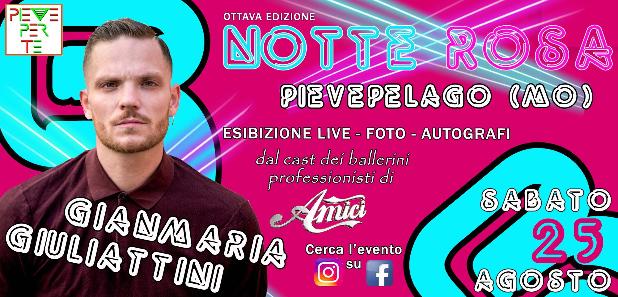È tutto pronto per l’ottava edizione della Notte Rosa di Pievepelago! La notte più bella dell’anno sarà ricca di mercatini, street food, musica dal vivo con Jackie Rose, i Roadhogs, i Diesel Engine Boneshaker e i Black in White, e i dj set di dj NAIA e Levent Rihan & Dj Dany! Non mancherà la partecipazione del Trt Crew! Super ospite della serata il ballerino professionista di Amici di Maria De Filippi GIANMARIA GIULIATTINI! Noi vi aspettiamo numerosissimi come sempre!
